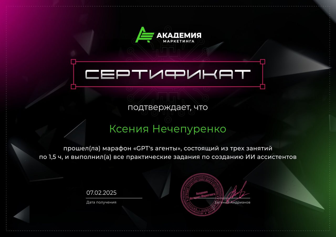 После курса я внедрила нейросети в работу — теперь я генерирую посты за 10 минут, экономя 12 часов в неделю. Благодаря автоматизации смогла протестировать 3 новые рекламные стратегии, а стоимость привлечения клиента снизилась на 30%."